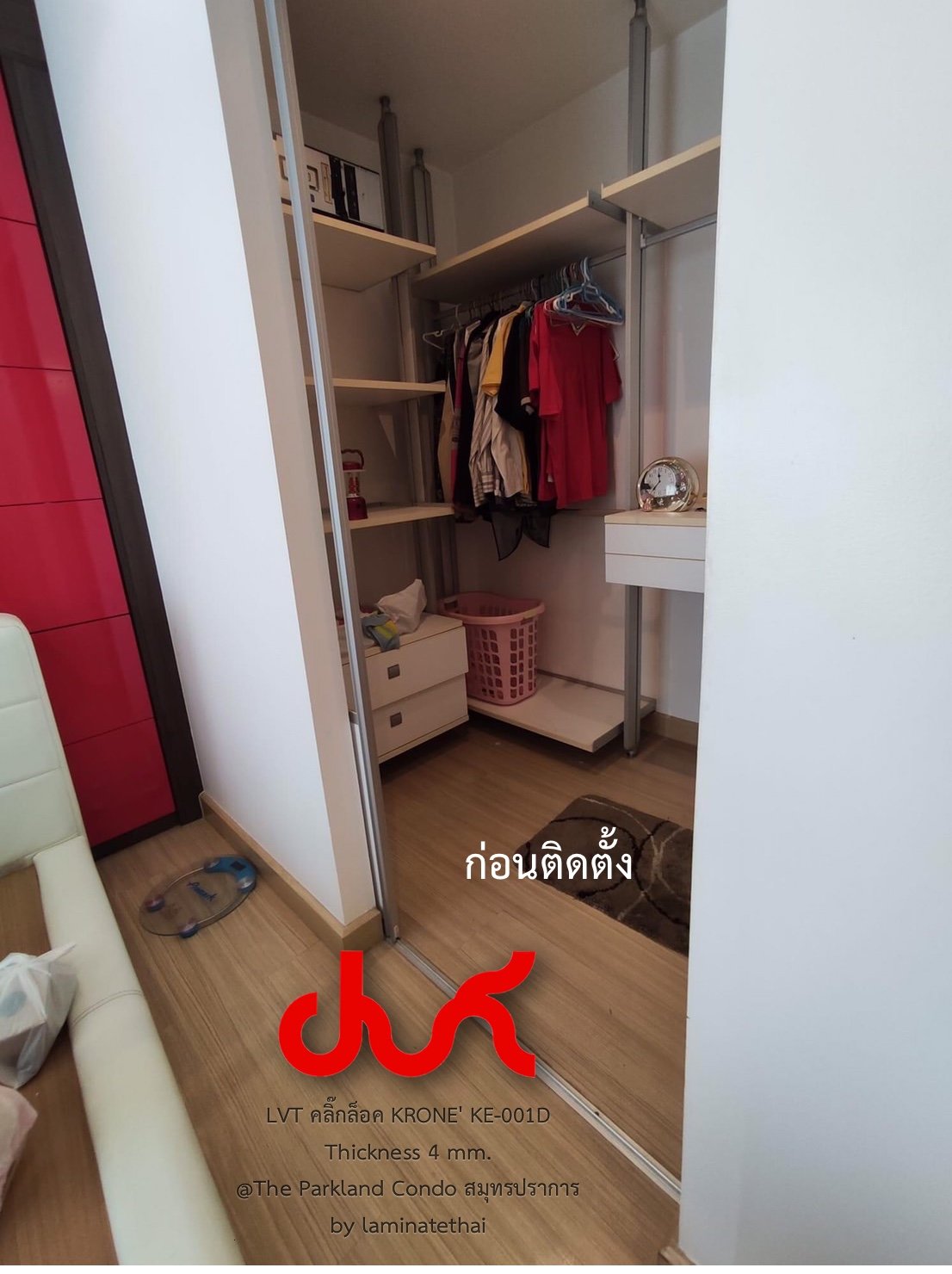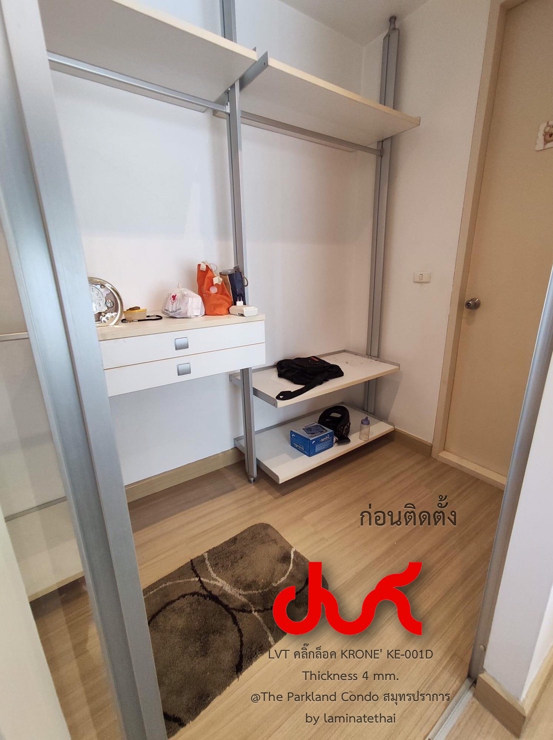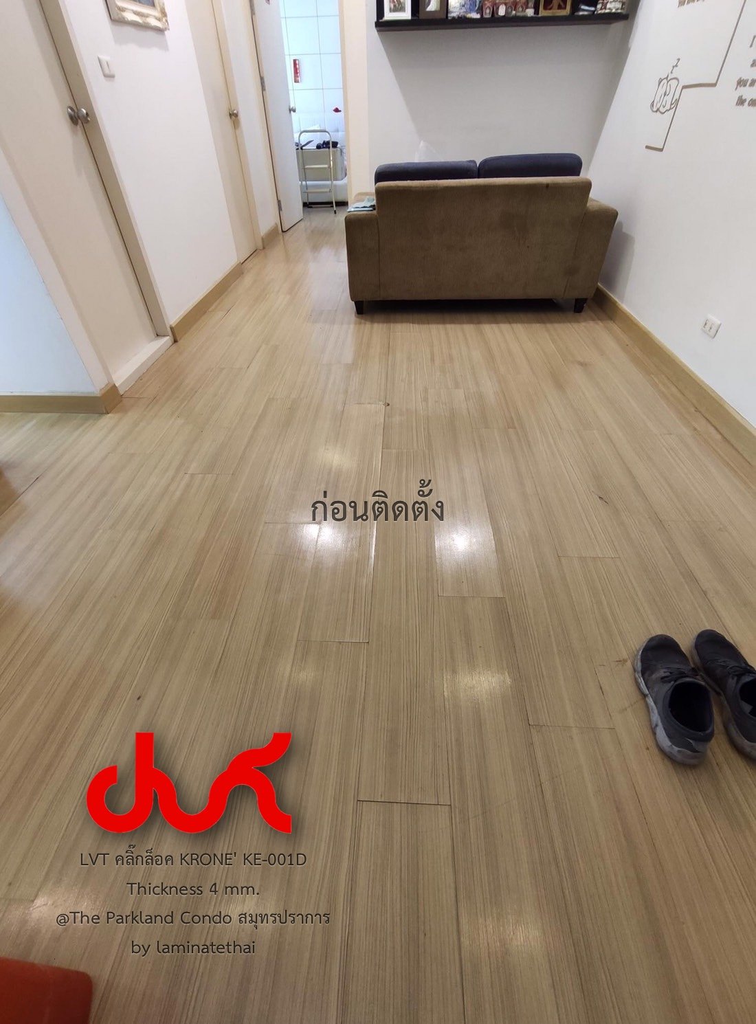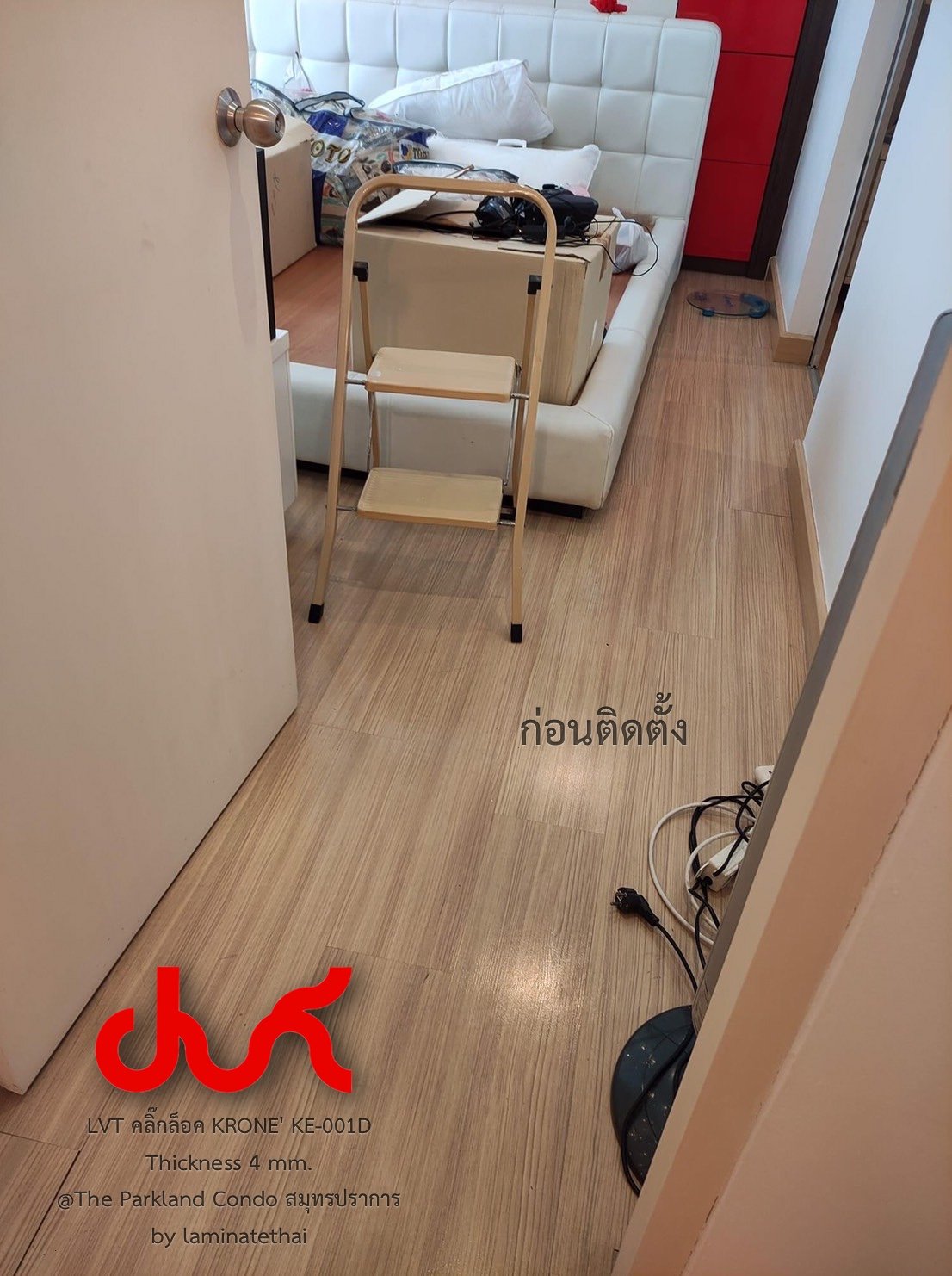 งานรื้อพื้น ไม้ลามิเนต เก่า เนื่องจาก น้ำรั่ว ทางร้านบริการรื้อพื้นไม้เก่า แล้วนำไปทิ้ง พร้อมติดตั้ง กระเบื้องยาง ลายไม้ LVT คลิ๊กล็อค โครเน่ KRONE' KE-001D ความหนา 4 มม. ติดตั้งใหม่ทั้งยูนิต สามารถ ทำภายใน 1 วัน เสร็จ งานนี้ท่านเจ้าของห้องที่น่ารัก เข้ามาตรวจงานด้วยตัวเอง