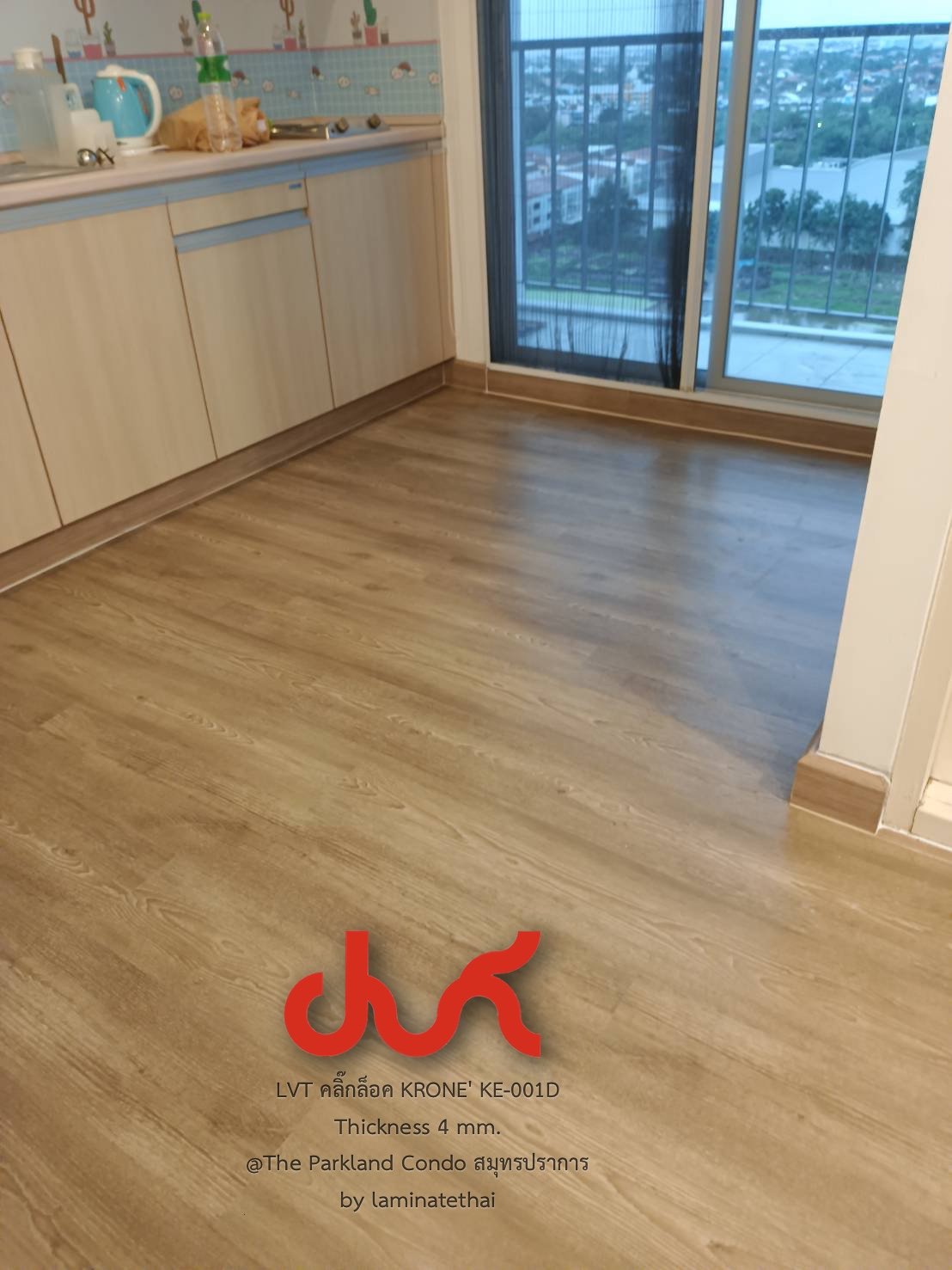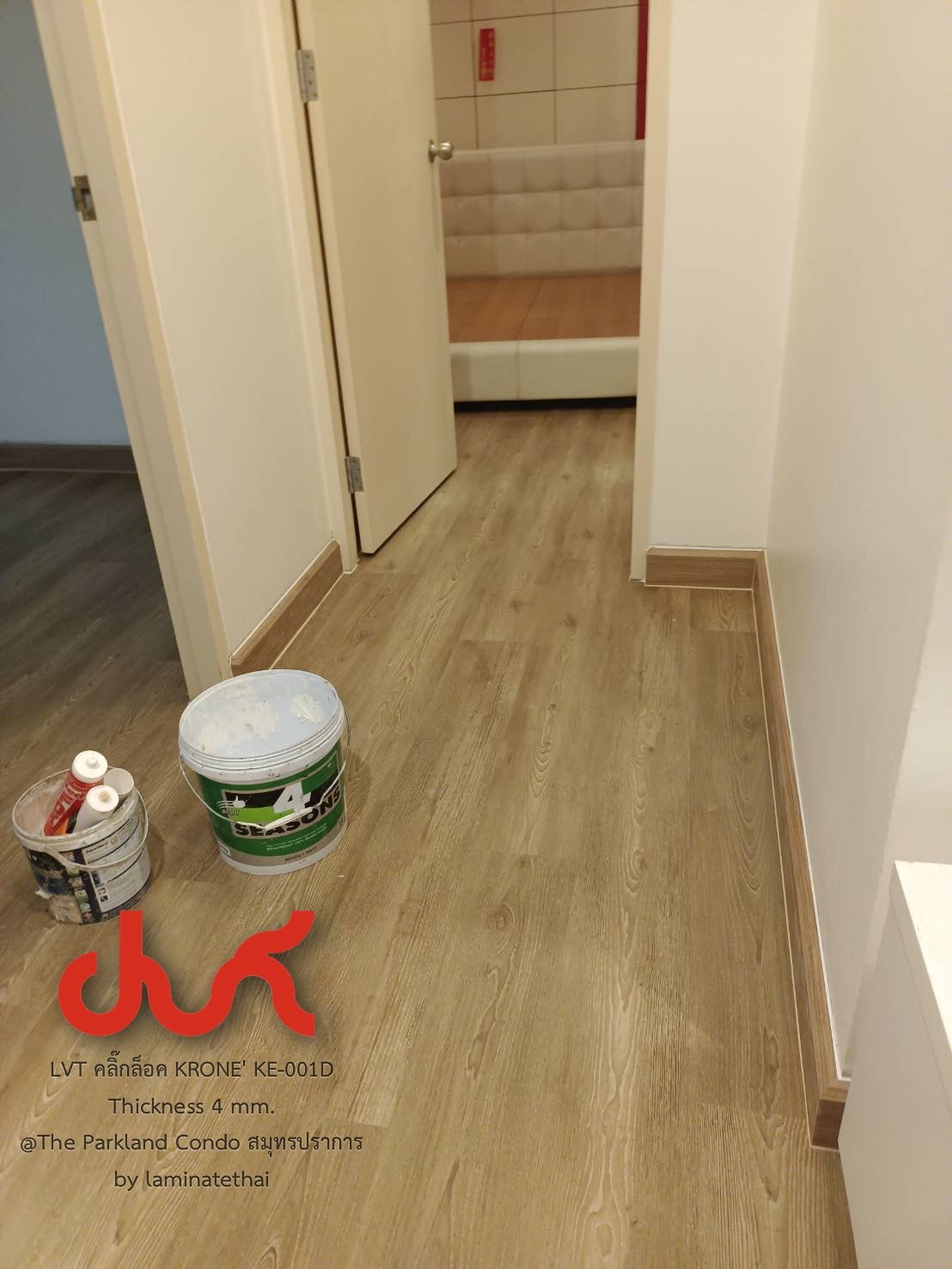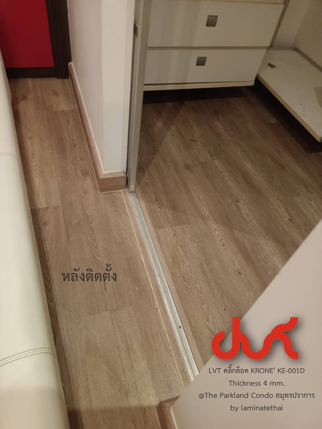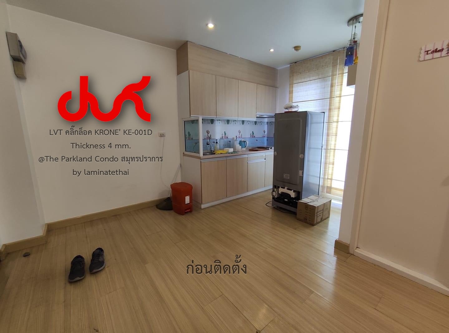 งานรื้อพื้น ไม้ลามิเนต เก่า เนื่องจาก น้ำรั่ว ทางร้านบริการรื้อพื้นไม้เก่า แล้วนำไปทิ้ง พร้อมติดตั้ง กระเบื้องยาง ลายไม้ LVT คลิ๊กล็อค โครเน่ KRONE' KE-001D ความหนา 4 มม. ติดตั้งใหม่ทั้งยูนิต สามารถ ทำภายใน 1 วัน เสร็จ งานนี้ท่านเจ้าของห้องที่น่ารัก เข้ามาตรวจงานด้วยตัวเอง