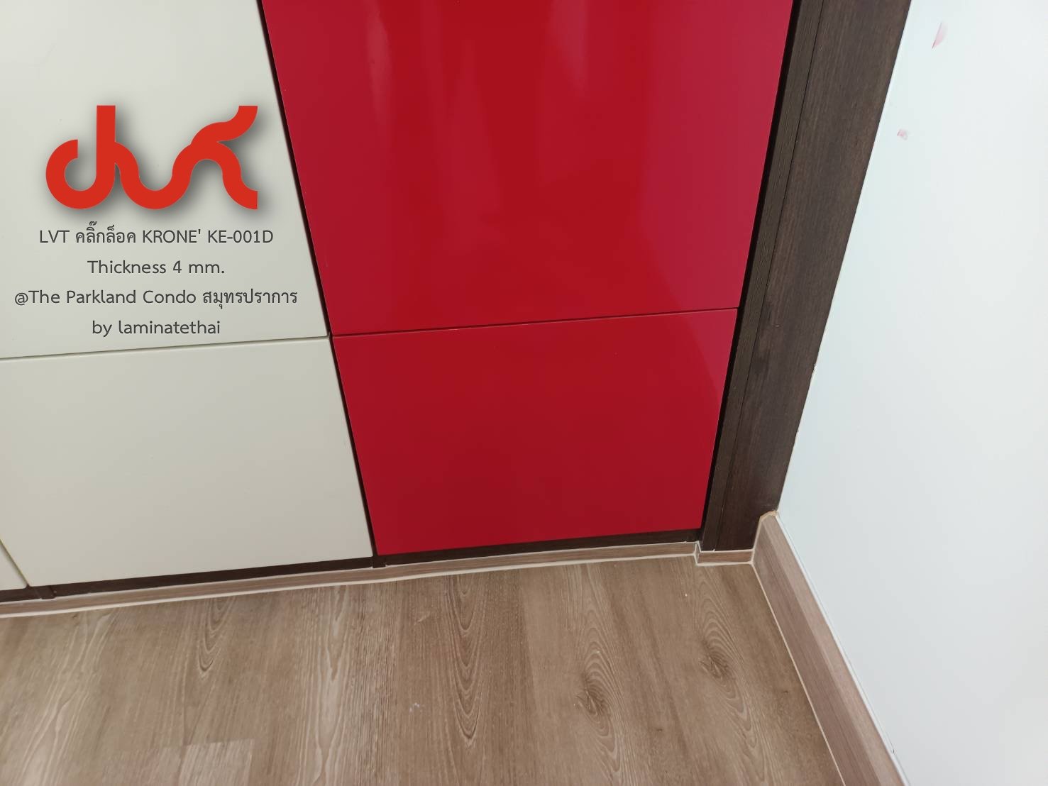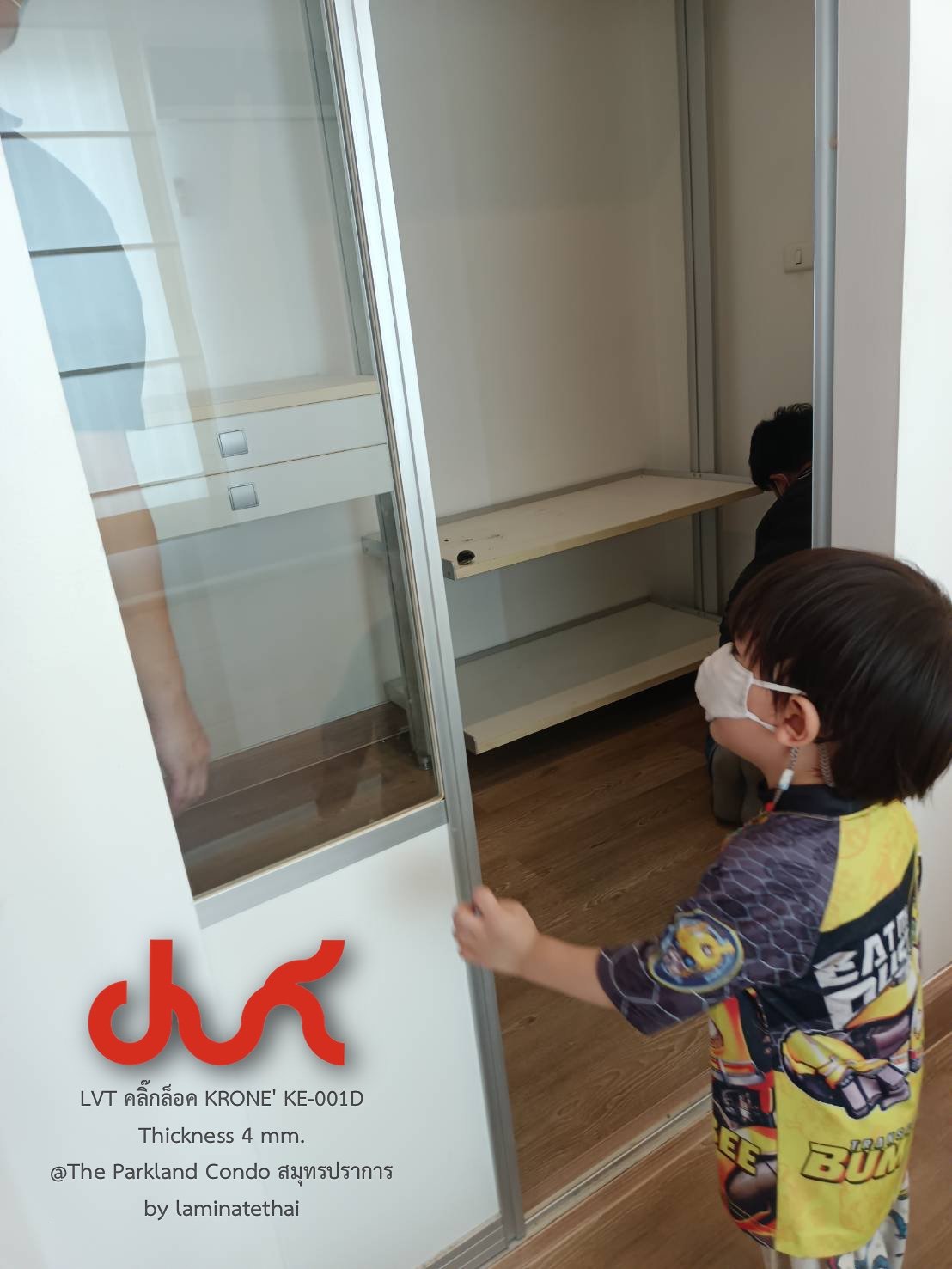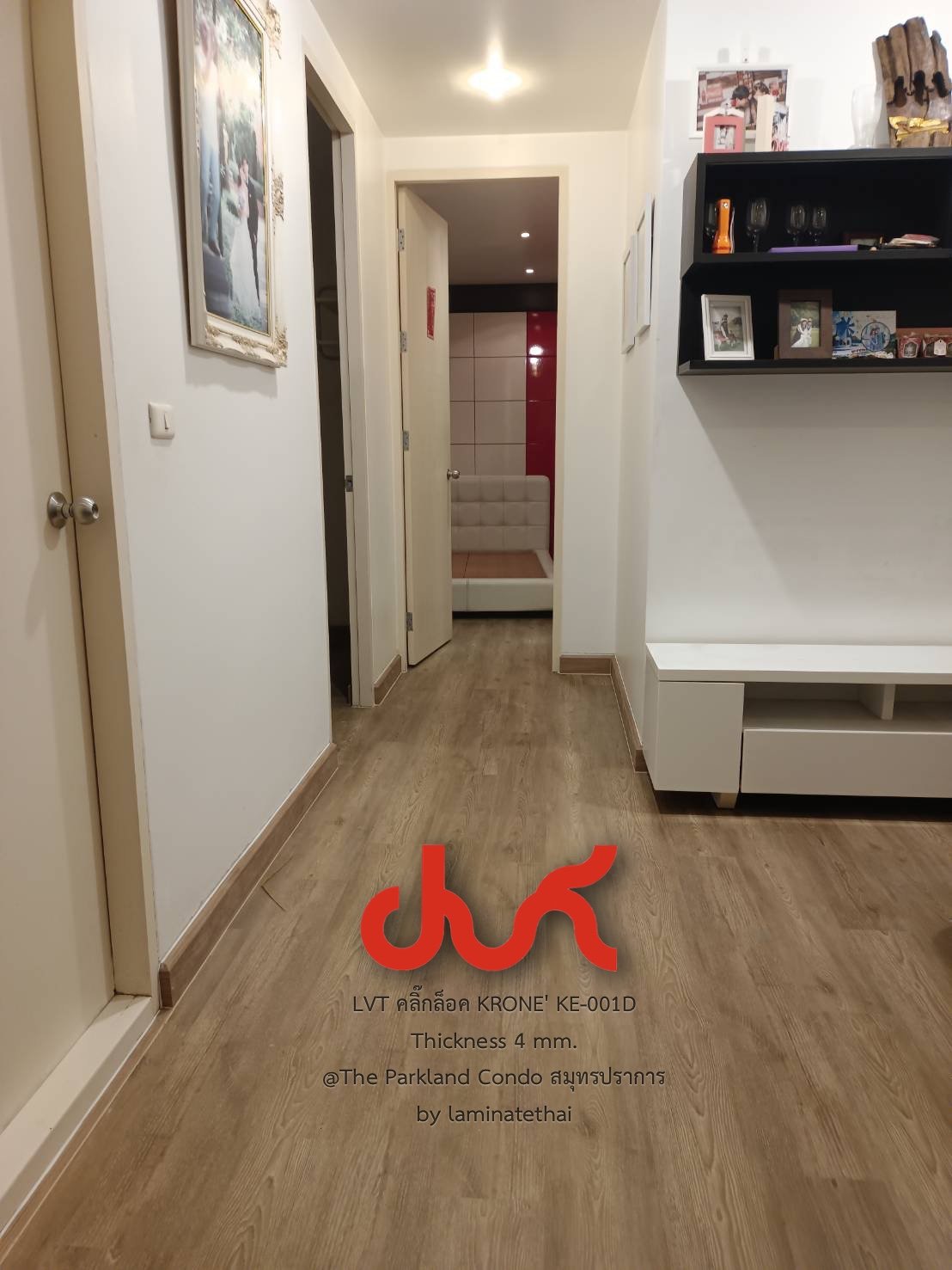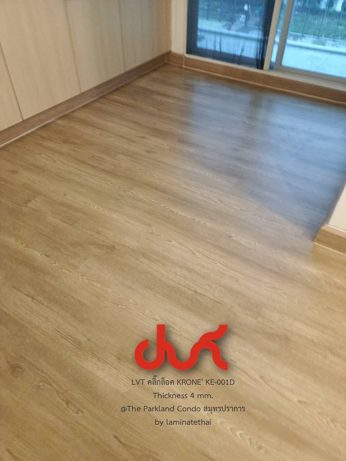 งานรื้อพื้น ไม้ลามิเนต เก่า เนื่องจาก น้ำรั่ว ทางร้านบริการรื้อพื้นไม้เก่า แล้วนำไปทิ้ง พร้อมติดตั้ง กระเบื้องยาง ลายไม้ LVT คลิ๊กล็อค โครเน่ KRONE' KE-001D ความหนา 4 มม. ติดตั้งใหม่ทั้งยูนิต สามารถ ทำภายใน 1 วัน เสร็จ งานนี้ท่านเจ้าของห้องที่น่ารัก เข้ามาตรวจงานด้วยตัวเอง