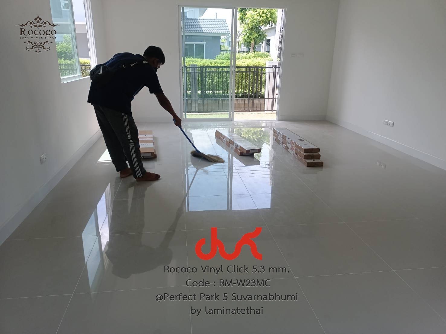 JOB : ติดตั้ง กระเบื้องคลิ๊กล็อค ระบบคลิ๊กล็อค ไม่ต้องใช้กาว ทับพื้นแกรนิตโต้เดิม พร้อมบัวและตัวจบ