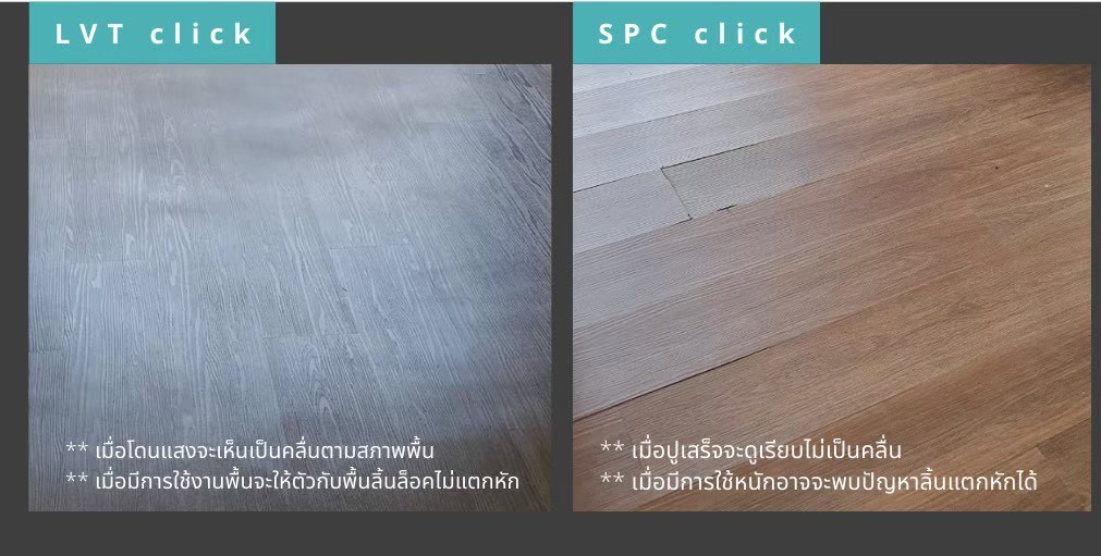 - SPC CLICK LOCK พื้นวัดสุ PVC ที่มีส่วนผสม ของหินปูน แคลเซี่ยมคาร์บอเนต และ ผงพลาสติกพีวีซี (SPC = Stone Plastic Composite) ทำให้เนื้อวัสดุ มีความแข็งแรง เป็นแผ่นเรียบเสมอทั้งแผ่น ให้ผิวสัมผัสเหมือนไม้ แต่มีความคงทนต่อความชื้น ไม่มีปัญหาเรื่องปลวก ด้วยเนื้อวัสดุที่ไม่มีส่วนผสมของไม้